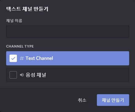 텍스트 채널 혹은 음성채널 선택이 가능하며 나중에 변경도 가능합니다.